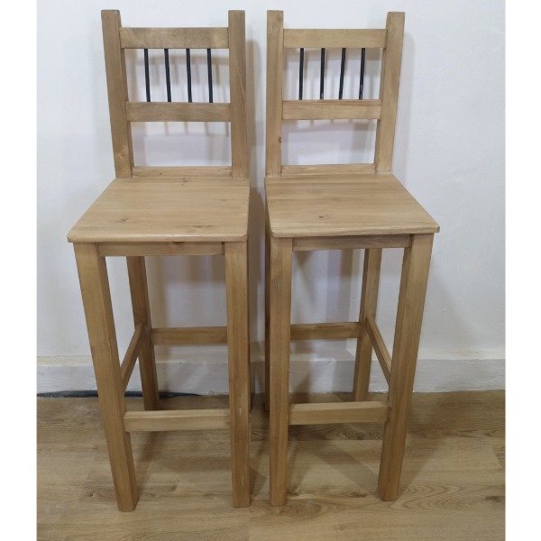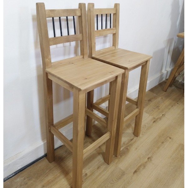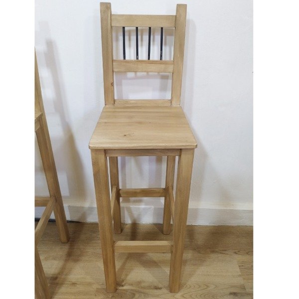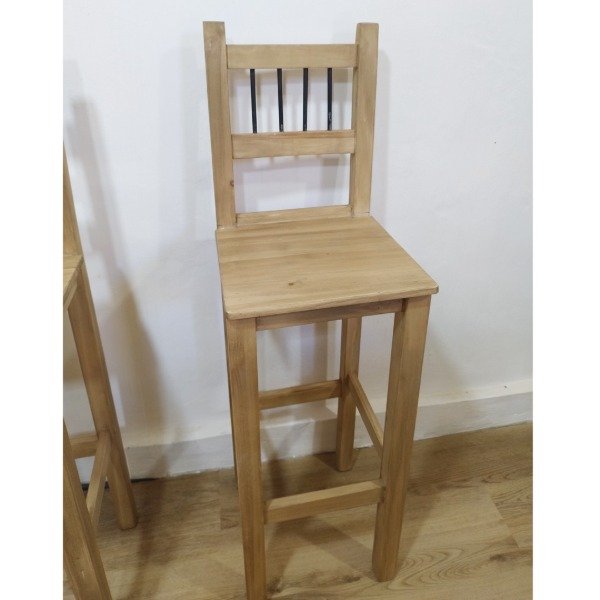 FABRICACIÓN: Elaborado en madera de álamo de alta calidad, este taburete asegura resistencia y durabilidad. Su diseño, con varillas de hierro como detalle en el respaldo, le otorga un toque moderno y sofisticado.