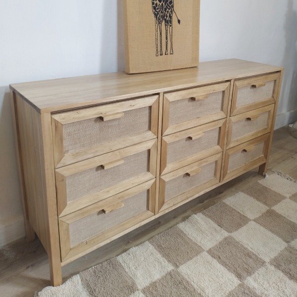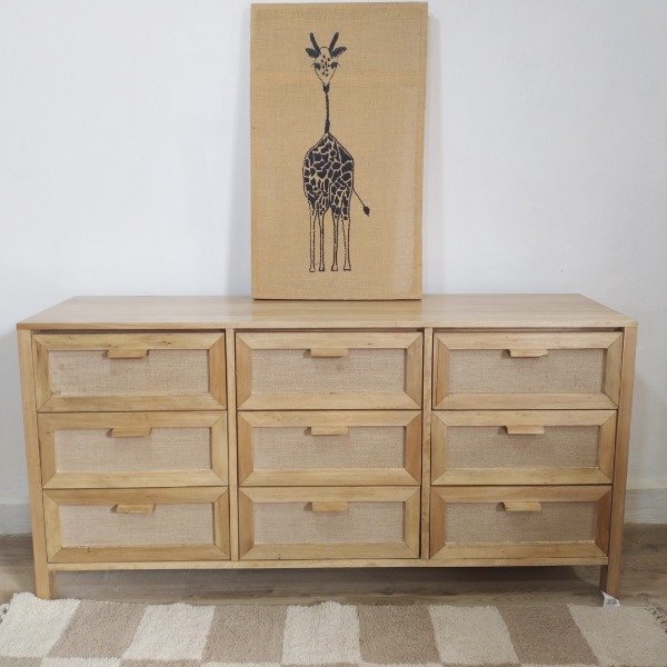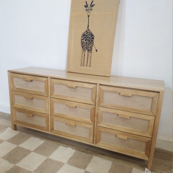 Descubrí esta elegante cómoda de madera álamo combinada con fibras naturales, diseñada para quienes buscan un mueble que armonice calidad y naturaleza. Con sus 9 amplios cajones y medidas de 160x45x80 cm, es ideal para optimizar el espacio y mantener todo organizado con un toque sofisticado.